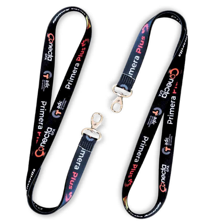 Portagafete de cinta satinada, sublimada a color por ambos lados y con gancho perico.