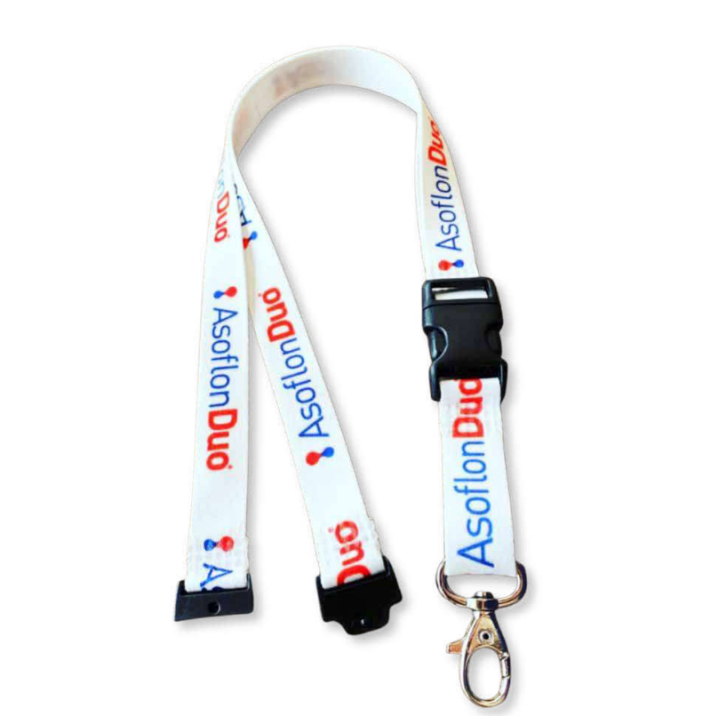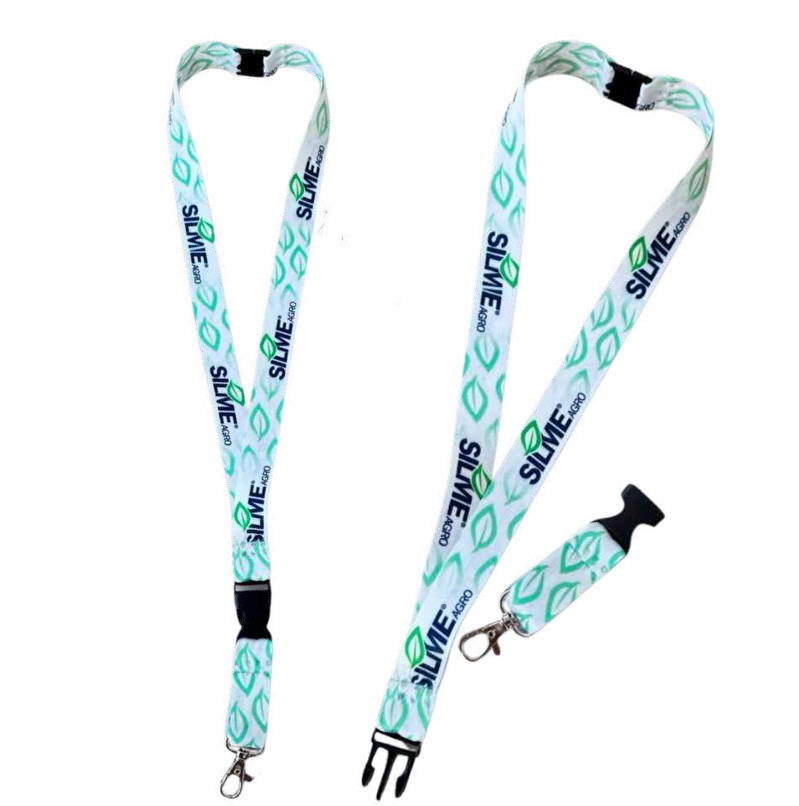 Portagafete de cinta satinada, sublimada a color por ambos lados, con gancho perico, broche delantero jordao y broche trasero de seguridad